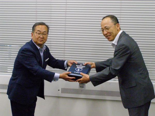 危機管理局を訪問し、上山危機管理監兼危機管理局長にAEDを手渡しました。